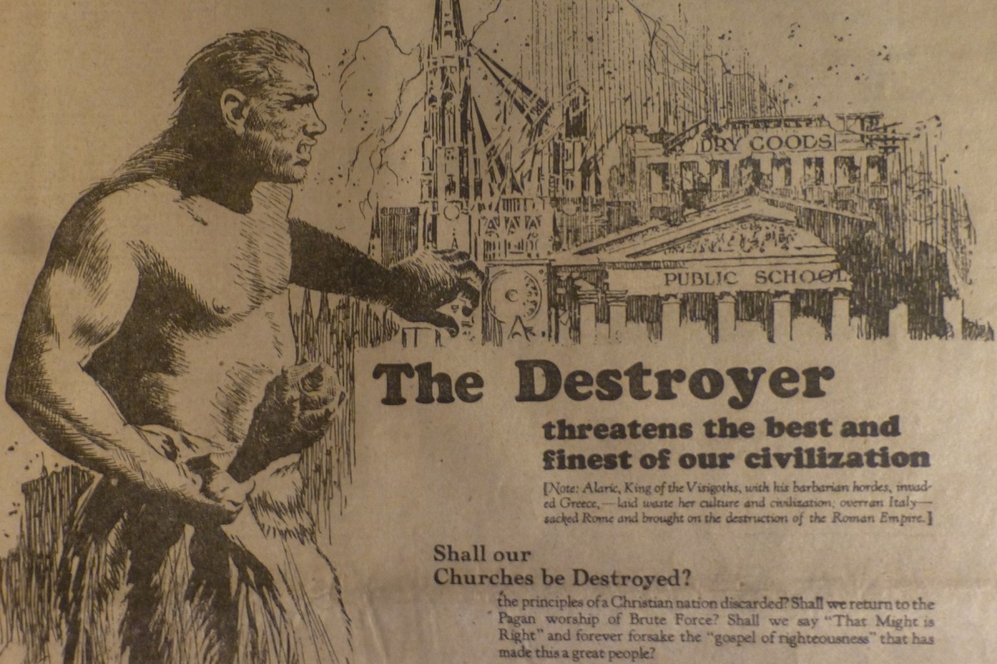 The Berkeley Daily Gazette ran a full-page ad Oct. 17, 1925, featuring a fur-clad, club-wielding, Neanderthal-like giant poised to destroy a city, presumably an image of barbarism against civilization as one group’s depiction of what letting stores stay open on evenings and Sundays could mean. (image courtesy of the Berkeley Historical Society and Museum)