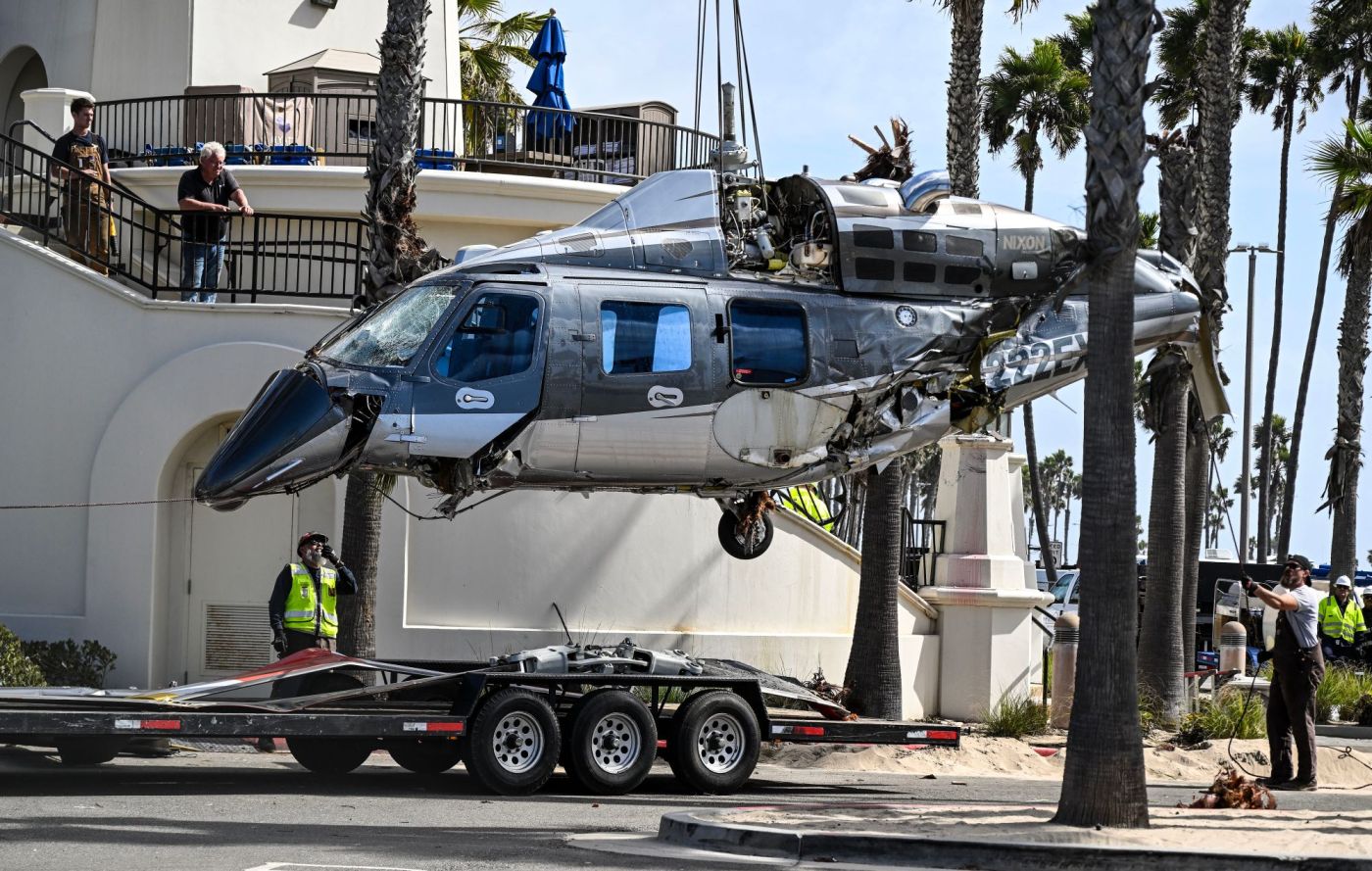 Workers use a crane to remove a 1980 Bell 222 helicopter from where it crashed on Saturday – on the beachside of a bridge that crosses Pacific Coast Highway to the Hyatt Regency in Huntington Beach, CA, on Monday, Oct. 13, 2025. Eric Nixon was piloting the helicopter when it spiraled toward the ground during a preview to Sunday’s Cars ‘N Copters on the Coast event. Five people were injured in the crash; Nixon, a woman in the helicopter with him, and a child and two adults on the ground. (Photo by Jeff Gritchen, Orange County Register/SCNG)