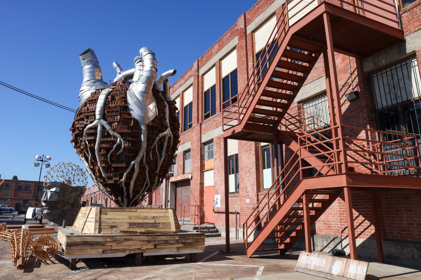 ‘Missing Link,’ a collaboration of 10 local artists, is set up in the installation for the Burning Man’s Decompression event at Embarcadero Cove in Oakland, Calif., on Friday, Oct. 17, 2025. Thousands of artists, performers, and community members are expected to attend the event on Saturday, which has moved from San Francisco to Oakland for the first time since the late 1990s. Interactive art, live performances, music stages, and community installations will be on display during this one-day civic celebration. (Ray Chavez/Bay Area News Group)
