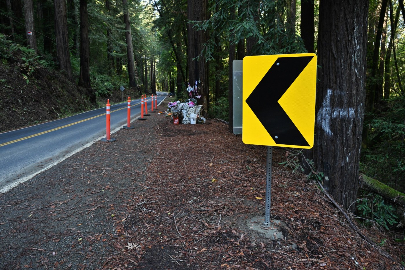 A roadside memorial lines San Geronimo Valley Drive in Woodacre on Thursday, Oct. 16, 2025 — six months after a crash killed four teens and critically injured two others. (Sherry LaVars/Marin Independent Journal)
